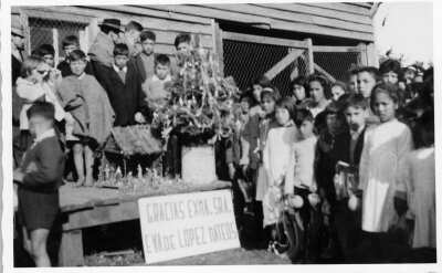 Registro de audio de la Inauguración Escuela Misión Cuinco. Francisco Valdés habla en mapudungun.. Acto Inauguración Oficial de la Escuela 169 Misión San Juan de la Costa. Monseñor Francisco Valdés conversa casualmente con el Cacique de San Juan de la Costa. Entrevistas y conversaciones realizadas mientras se visita el establecimiento. Habla el Cacique en chesungun y dos fiscales de su comitiva.